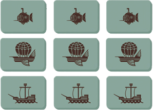 These nine wooden vessel tiles replace the punchboard ones in the game! Whether you like to travel by ship, submersible or flying machine, you can now do it in style.
